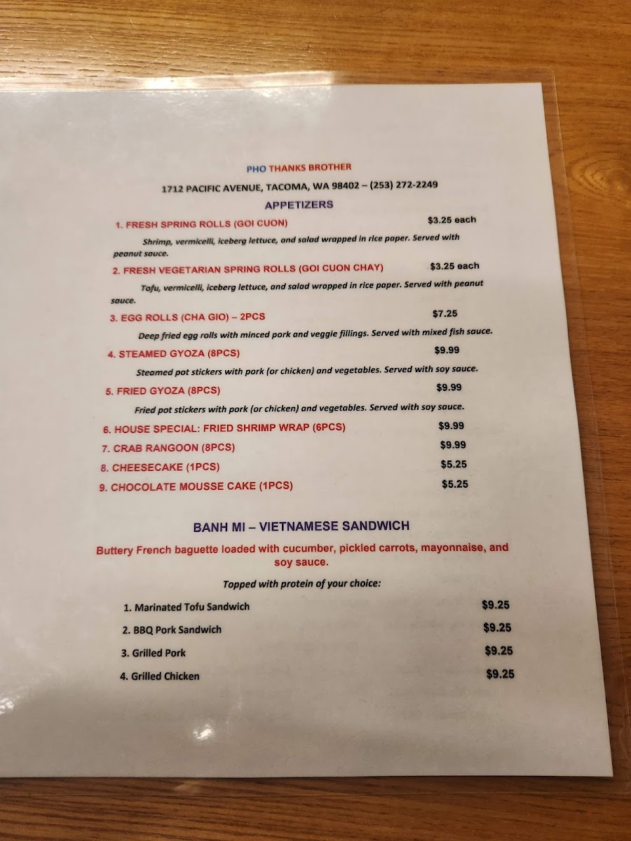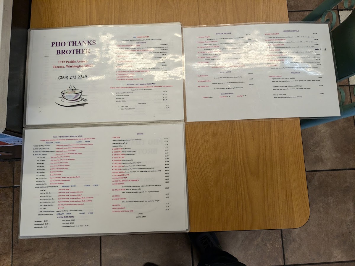 Pho Thanks Brother Menu